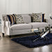 Enjoy a wonderful, relaxing day on this transitional-style American-built sofa! Dark wooden legs support the piece, while the individual nailheads add an air of luxury. The one piece bench-style back cushion is attached to the frame, and in front are accent pillows with beautiful pops of navy striped and floral patterns. Soft to the touch, the velvet-like fabric wraps around the piece in an inviting, warm light gray color.