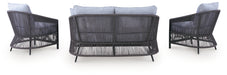 Ready to bring indoor style to your outdoor space? This beautiful 4-piece table and chair set is the perfect choice for creating a cozy patio retreat. A unique rope design lends the loveseat and lounge chairs a light and airy feel, while plush cushions wrapped in cleanable, UV-resistant fabric provide deep-seated comfort. And the table is just the spot to rest cocktails and coffee cups while you enjoy warm days and cool evenings with friends and family.