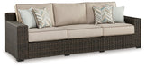 Who says the great outdoors isn’t made for luxury living? This sofa with cushion offers all the high-end design, plush comfort and durability you could ask for, and then some. Its all-weather, rust-proof aluminum frame provides the easy-breezy wicker look you love without the high maintenance. Rest assured, the high-performing Nuvella® fabric covering the cushions and throw pillows is made to stand up to the elements.