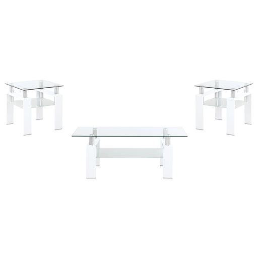CoasterThis modern coffee table set combines a rectangular coffee table and square end table, each featuring a clear tempered glass top and a frosted temp...