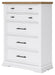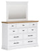 Details B844B5: Includes panel headboard, storage footboard, rails and roll slats, Footboard made with hardwood solids, MDF substrates and butcher block oak veneer, Headboard and rails made with hardwood solids and MDF substrates, White finish, Headboard with inset black metal barn sash, 2 drawers in footboard with fully finished interior, dovetail construction and ball-bearing side glides, Pulls with matte black finish, Bed does not require a foundation/box spring, Mattress available, sold separately, Assembly required, B844B1: Includes dresser and mirror, Made with hardwood solids, MDF substrates and butcher block oak veneer, Dresser with 2-tone finish (white finish; butcher block oak veneer with natural finish), Pulls with matte black finish, 10 spacious drawers with fully finished interiors (top drawers felt lined), dovetail construction and ball-bearing side glides , Drawers with inset picture fronts, Mirror attaches to back of dresser, B844-46: Made with hardwood solids, MDF substrates and butcher block oak veneer, 2-tone finish (white finish; butcher block oak veneer with natural finish), Pulls with matte black finish, 5 spacious drawers with fully finished interiors (top drawers felt lined), dovetail construction and ball-bearing side glides, Drawers with inset picture frame fronts, B844-93: Made with hardwood solids, MDF substrates and butcher block oak veneer, 2-tone finish (white finish; butcher block oak veneer with natural finish), Pulls with matte black finish, 3 spacious drawers with fully finished interiors (top drawers felt lined), dovetail construction and ball-bearing side glides, 110V power supply with dual USB charging ports, Power cord included; UL Listed, Drawers with inset picture frame fronts,