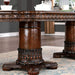 Bold and grand are some of the words that would describe this traditional dining set. Two pedestal bases hold the large table top adorned with intricate apron design. The chair backs play host to two different treatments--the armchair have button tufted leatherette, while the side chairs feature wooden backs with intricate carved details. Both chairs' front legs feature beautiful twisted rope carvings, details which they share with the optional hutch and buffet--it's the perfect setup for chinaware and memorabilia display.