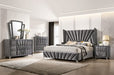 The ultimate Art Deco-inspired bedroom set! The elegance, the glamour, the unique shapes and vintage appeal of 1930’s Hollywood is right here! The decadent gray velvet upholstery looks like it came right out of a classic RKO black & white film! Whether you fancy yourself the dashing leading man or the stunning starlet, prestige awaits you with this unique design assembly that seems to capture all of the excitement of a massive movie premiere! Chrome feet provide the support while additional embellishments such as nailhead trim and diamond ring drawer pulls faithfully enhance this cinematic reality.