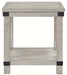 Sporting a distressed whitewash finish, this end table is rustic farmhouse living at its best. Crossbuck styling adds striking flair. Metal industrial brackets incorporate an industrial twist.