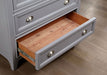 Take serenity home with this chest from the Castile collection. Topped with beautiful crown molding details, the gray finish and the nickel cup pulls complement each other well in tone and hue.