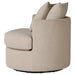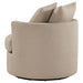 Capture the essence of stylish versatility with a modern swivel accent chair. Perfect for living room or den, it's a compact silhouette with a round frame and pocket coil springs in its foam seat cushion, creating incredible comfort for lounging or entertaining. The chair features a swivel base, adding easy movement and making it a lovely choice for a multi-functional space. Its rounded backrest includes foam cushioning and is complemented with a pair of pillows that bring softness to the overall presentation. Its warm upholstery sets the tone for your space and serves as a stylish neutral to complement surrounding decor choices.