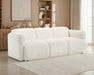 This sculptural sofa blends soft form with enduring comfort for a modern, relaxed atmosphere. Upholstered in a richly textured fabric with a cozy hand, its rounded profile flows seamlessly from the low back to wide, curved track arms. Built with high-quality foam and supportive pocket coil seating, it invites you to sink in and stay awhile. Fully finished and designed for everyday ease, this three-seat sofa anchors the living space with plush, minimalist style.
