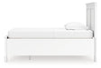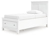 Details Includes panel headboard, storage footboard, rails and roll slats , Made with hardwood solids and MDF substrate, Side rails feature laminated solid hardwood slat support rails (or LVL) with glued and screwed blocking for added strength , White painted finish, Round metal drawer knob with satin nickel-tone finish, Tapered feet, Smooth-gliding drawer in footboard , Bed does not require additional foundation/box spring; accommodates most zero clearance adjustable bases with the addition of a bunkie board , Mattress available, sold separately, Assembly required