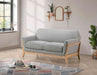 With its sleek contours and vintage-inspired presence, this loveseat blends sculptural form with plush comfort. Flared arms and a smoothly arched backrest create an inviting silhouette, while the blonde wood base frames it in minimalist warmth. Upholstered in soft polyester fabric and built with a solid rubberwood foundation, this tailored piece elevates lounge areas, reading corners, or smaller living spaces with timeless appeal.