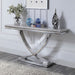 This sofa table is designed with luxury and exuberance in mind. It features a faux marble top with beveled edges, held up by curved pedestals finished in brilliant chrome. With the interlocking design resting upon a similarly sleek chrome base, it will complete any exquisite home decor.